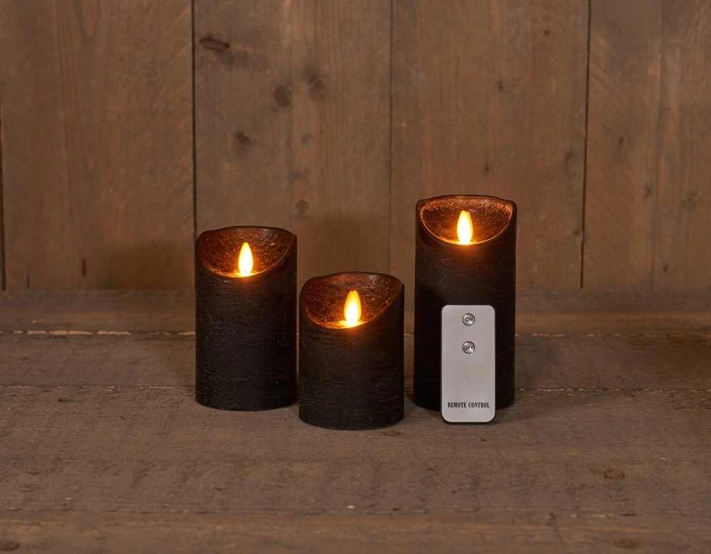 Anna’s Collection 3st. LED Rustiek wax stompkaars Zwart – Ø 7,5 x H 10/12,5/15 cm