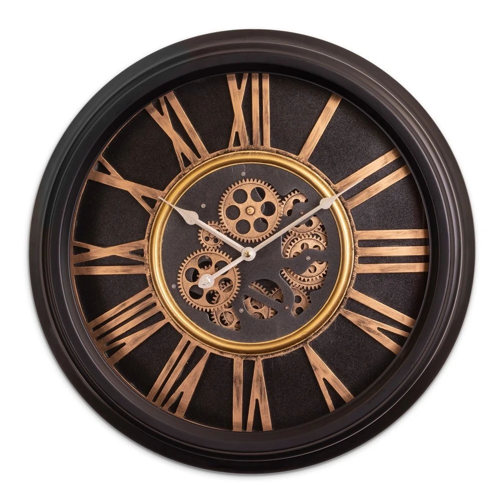 Ben je op zoek naar een stoere wandklok met een industriële uitstraling? Dan is deze Wandklok Zermatt – Ø 52 x H 8 cm echt iets voor jou. Wat deze klok uniek maakt, zijn de meedraaiende tandwielen die afzonderlijk aangezet kunnen worden d.m.v. AA batterijen (worden niet meegeleverd). Deze klok is zwart van kleur met gouden accenten. De tijd wordt aangegeven met Romeinse cijfers.