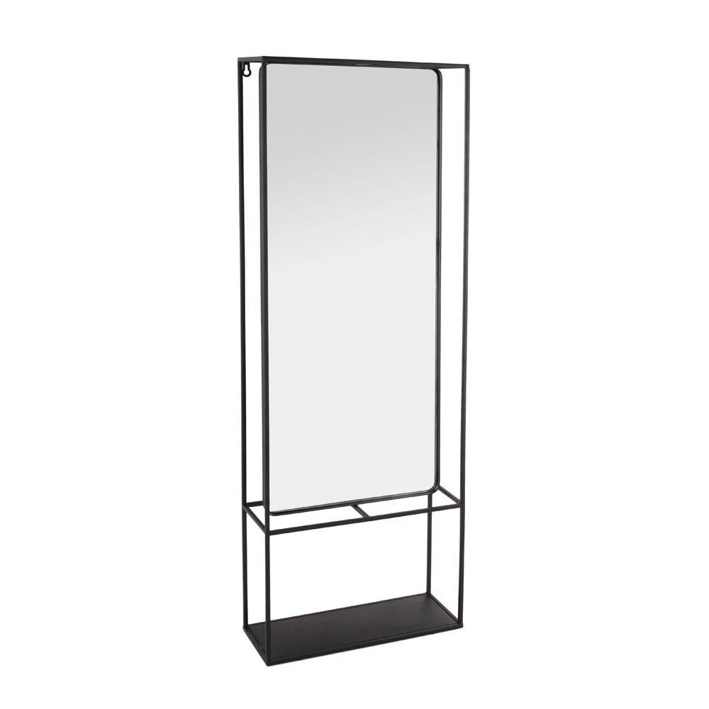 Zwart metalen wandrek met spiegel. Afmetingen van het rek: 40 x 15cm, met een hoogte van 115cm. Sober, eigentijds vormgegeven en zeer functioneel.